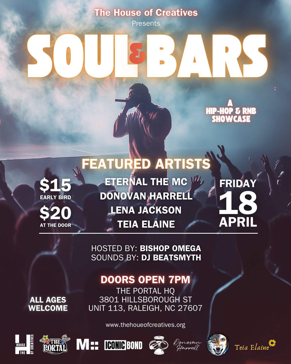 Experience “Soul & Bars,” a vibrant showcase highlighting local Hip-Hop and R&B talent at The Portal HQ. Presented by The House of Creatives, this event celebrates the rich, under-represented voices of our community with performances by Eternal the MC, Donovan Harrell, Lena Jackson, and Teia Elaine. Join us on Friday, April 18th, for a night where each verse and harmony captures the essence of “Soul & Bars.”